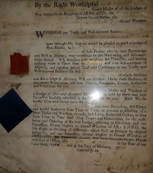 The Grand Lodge of Ireland issued Warrant No 447 to the Masonic Lodge in Newtownards on November 6, 1766. It is the 24th oldest Lodge in Ireland and the 3rd oldest in the Province of Down. The warrant was signed by the Rt Worshipful and Rt Honourable Earl of Cavan, Grand Master; Rt Wor Holt W. Waring, Deputy Grand Master; George Hart and Peter La Touche, Grand Wardens; and John Calder, Grand Secretary.