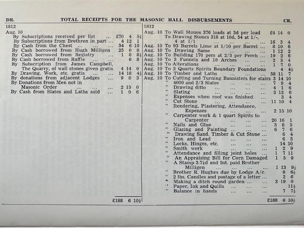 When the Lodge received the land, they prematurely harvested the corn, laid the foundations, and compensated the brewer £1 5s 9d for damages. The hall’s construction costs, totalling £188. 6s. 10.5d, were covered by subscriptions or work in lieu of payment. Despite some defaults, the Lodge cleared the debt within four years, maintaining a balance of 7s 7.5d.