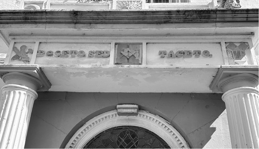 In 1836, a portico featuring fluted sandstone pillars and an ornamental arch with several Masonic emblems was added. The arch included the date in Roman Numerals and the Latin motto “Doceto sed Taceto”, meaning “He must teach, but he must be silent,” or “Teaching by Example.” This clarified the purpose and ideals of Freemasonry to the public.